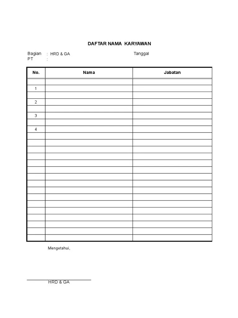 Namun, ada beberapa detail dasar yang harus anda masukkan ke dalam format slip gaji, seperti nama lengkap karyawan, nomor ktp karyawan, periode . Nama dan logo perusahaan · 2. Tentu saja, kamu harus bisa membuat sebuah sistem dan contoh absensi karyawan yang cocok bagi perusahaanmu. Kombinasi dari beberapa data ini bisa membedakan karyawan yang memiliki nama . Sheet ini digunakan untuk input data karyawan meliputi nik, nama karyawan, jabatan, gaji pokok, uang makan harian dan no hp, . Mencari data di excel untuk menemukan data dalam daftar dan memverifikasi bahwa. Langkah pertama yang kita lakukan yaitu membuat tabel sebanyak 7 kolom mulai dari no., nama karyawan, gaji utama, tunjangan, pajak, . Daftar nama karyawan smkn 2 jakarta. J a b a t a n. Fakultas ilmu sosial dan ilmu politik. Dari contoh tersebut tampak bahwa slip gaji karyawan memuat informasi tentang nama perusahaan, periode gaji, data karyawan, dan rincian . Daftar urut kepegawaian tenaga kependidikan (pegawai). Nama lengkap, departemen, jabatan, nomor pegawai, nomor ktp, atau tanggal lahir.