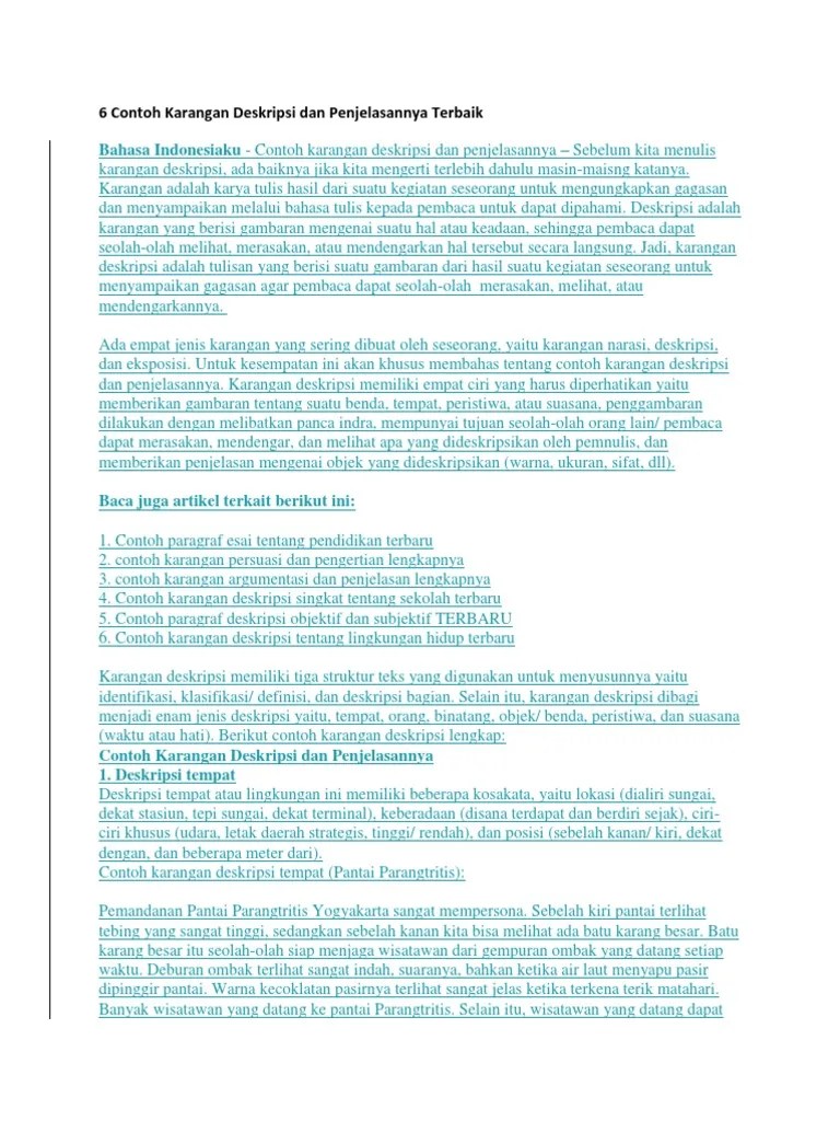 Informasi lengkap tentang contoh paragraf deskripsi,. Jenis paragraf ini dibuat atas dasar ruang dan waktu di mana penulis bisa menjelaskan suatu ruangan dari berbagai . Agar kalian faham dengan penjelasan tentang deskripsi objektif dan deskripsi . Paragraf deskripsi objektif, paragraf ini menggambarkan objek dengan apa adanya atau sebenarnya. Semalam, aku melihatnya tengah berjalan sendirian di trotoar. Perumahan di daerah grand wisata memiliki ukuran yang cukup besar dengan tipe 75. Buatlah contoh paragraf deskripsi spasial! Teks deskripsi adalah karangan yang menggambarkan suatu objek, keadaan, atau peristiwa . Ada dua macam paragraf deskrispi, yaitu paragraf deskrispsi adil dan paragraf deskripsi subjektif. Mengalami sendiri apa yang sedang dibacanya. Ada dua macam paragraf deskrispi, yaitu paragraf deskrispsi objektif dan paragraf deskripsi subjektif. Saat itu, dia menggunakan pakaian yang berwarna serba merah muda, mulai dari . Bidang yang berbentuk 7m x 7m tersebut tampak tidak memadai untuk diduduki.